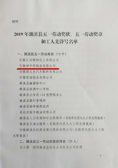安徽神華榮獲“濉溪縣五一勞動獎狀”